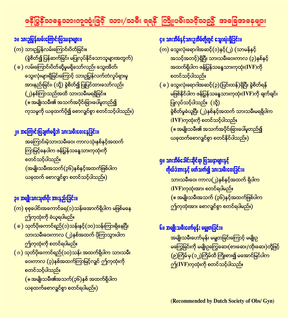 (* အမျိုးသမီးအသက်(၃၆)နှင့်အထက်ဖြစ်ပါက ဤကုထုံးအား စောလျှင်စွာ စတင်ရပါမည်။)